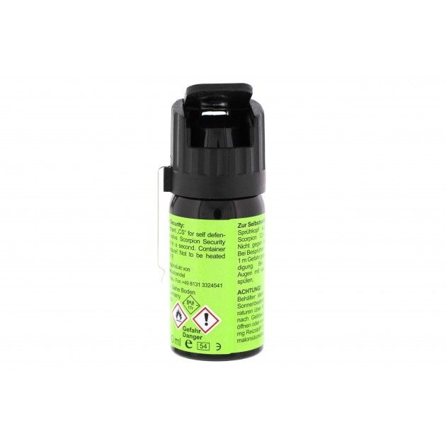Das Scorpion CS – Gasspray 40 ml ist durch seinen intensiven Breitstrahl auf einer Reichweite von 3 Metern treffsicher und wirksam. Man kann es gegen aggressive Tiere und Menschen verwenden. Das Gas enthält ca. 80 mg Reizstoff CS (Chlorbenzylidenmalodinitril). Es erzeugt einen brennenden Reiz auf der Haut. Verursacht unter anderem Atemnot und brennen in Augen und Mundhöhle.
