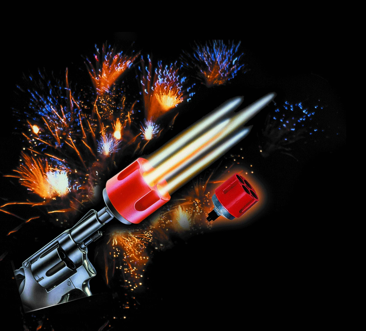 Der Multi Shooter ermöglicht den gleichzeitigen Abschuss von vier Signalpatronen. Dadurch können vielseitige Bilder in den Silvester-Himmel gezaubert werden. Mit den beiliegenden drei Adaptern C, I und K ist er passend für alle gängigen Schreckschusswaffen.
