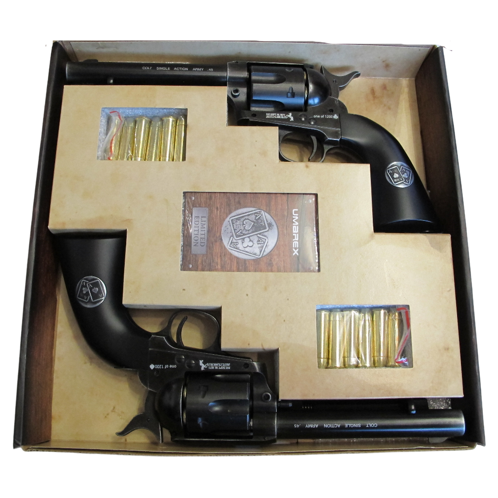 Lassen Sie sich mit dem limitierten Double Aces Duel Set in die Zeit des Wilden Westen versetzen. Denn neben den beiden Colt Single Action Army Revolvern mit Editions-Seriennummer enthält es ein Poker-Spielkartenset und pro Revolver gleich zwölf Metall-Ladehülsen.