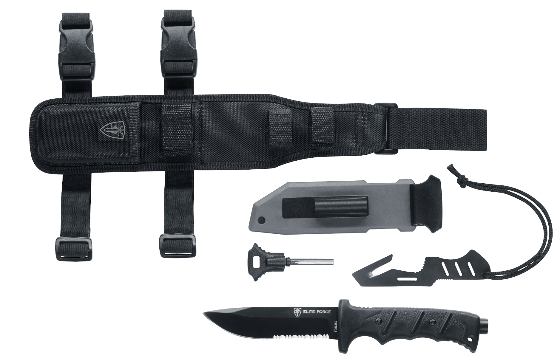 Feuerstarter, integrierte Schleiffläche, handlicher Gurtschneider, Nylon-Oberschenkel Tragesystem