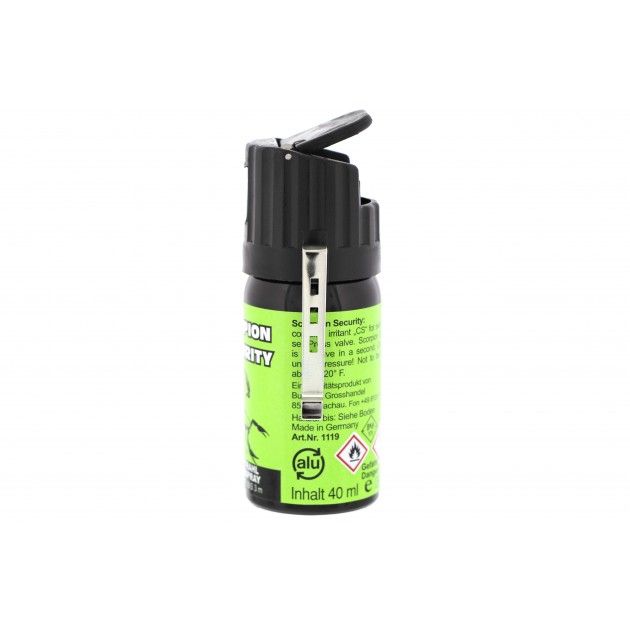 Das Scorpion CS – Gasspray 40 ml ist durch seinen intensiven Breitstrahl auf einer Reichweite von 3 Metern treffsicher und wirksam. Man kann es gegen aggressive Tiere und Menschen verwenden. Das Gas enthält ca. 80 mg Reizstoff CS (Chlorbenzylidenmalodinitril). Es erzeugt einen brennenden Reiz auf der Haut. Verursacht unter anderem Atemnot und brennen in Augen und Mundhöhle.