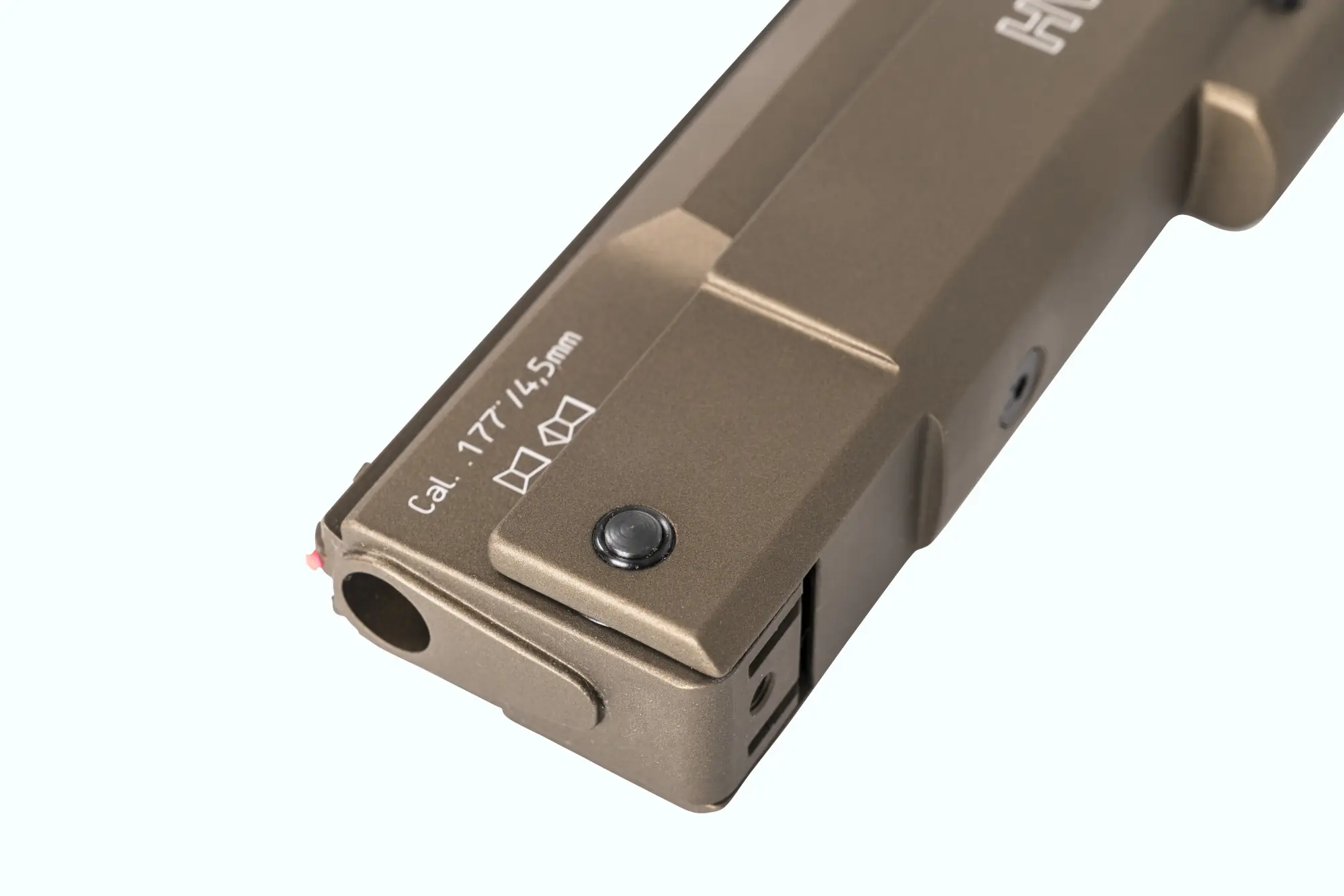 Sehr kompakte Baugröße für eine Luftpistole mit dieser sehr hohen Leistung. Wahlweise auf zwei Stufen zu spannen, ohne Pumpen o. ä., mit Federkolbensystem. Weitere Vorzüge: matchähnlich verstellbarer Druckpunktabzug und fein einstellbares Mikrometervisier mit Fiberoptik. Die Prismenschiene eignet sich für die Zielfernrohrmontage.
